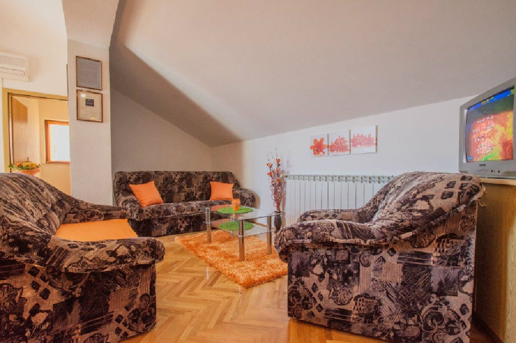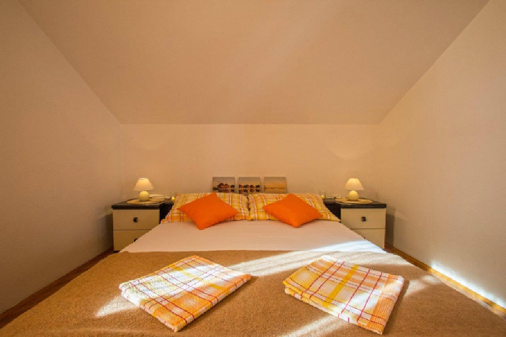Apartman s dvije sobe sa bračnim ležajem i pomoćni ležaj u dnevnom boravku.