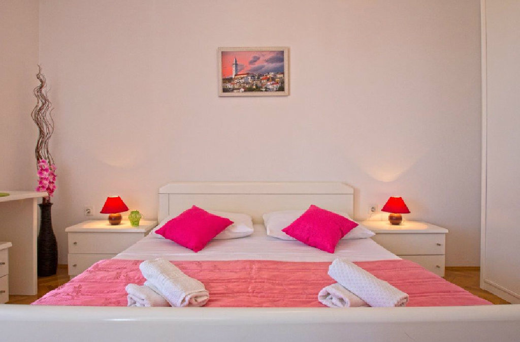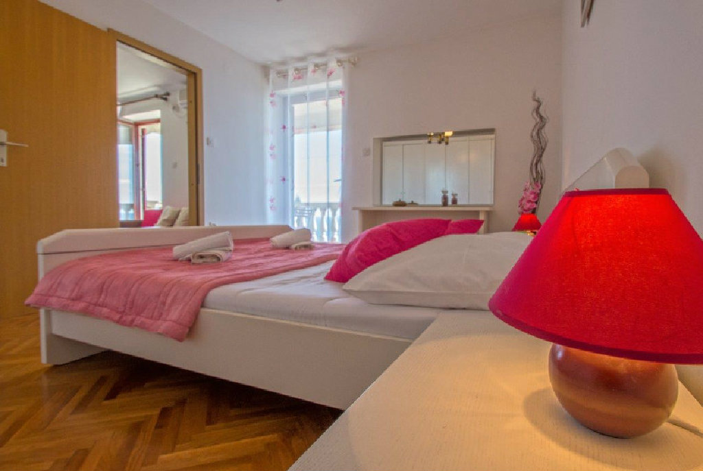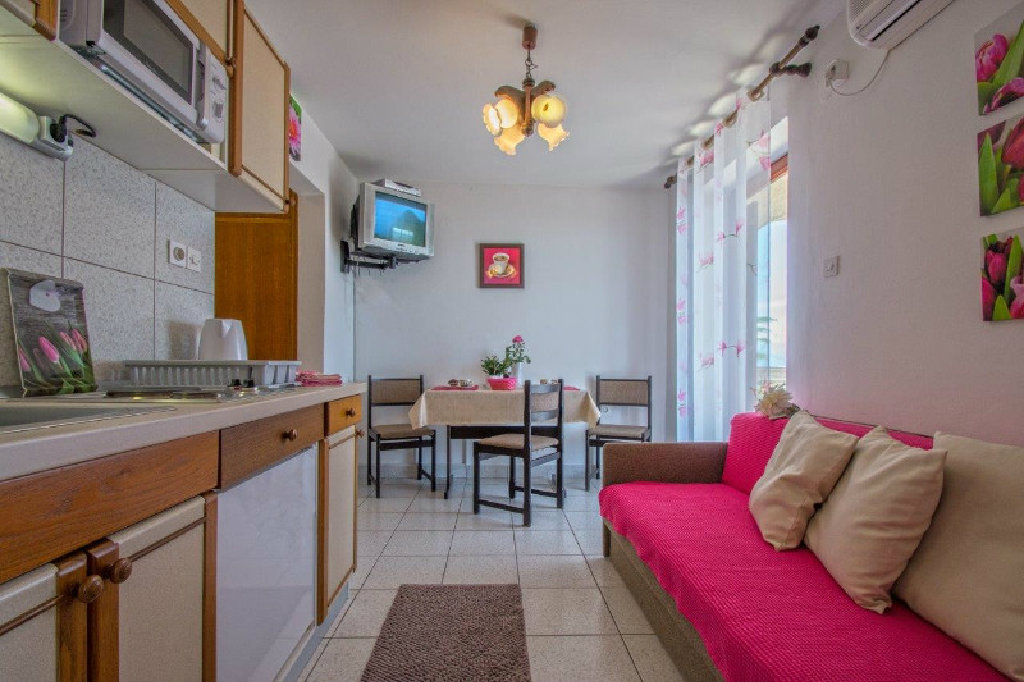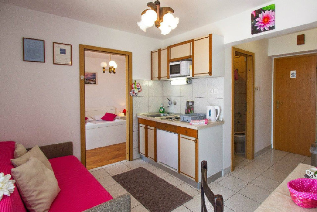 Apartman s jednom sobom sa bračnim ležajem i pomoćni ležaj u dnevnom boravku.