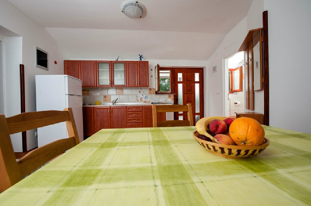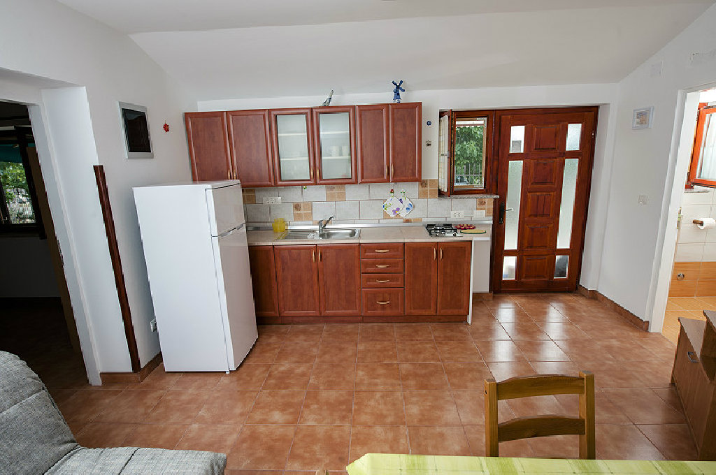 Kuhinjski elementi su dužine 2,5 m i tu su: štednjak na plin, frižider, zamrzivač, mikrovalna pećnica. Kuhinjski stol je za 4 osobe.