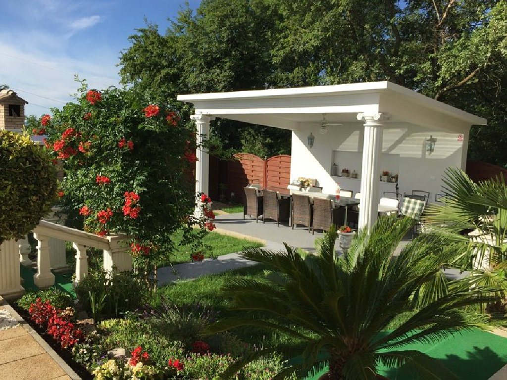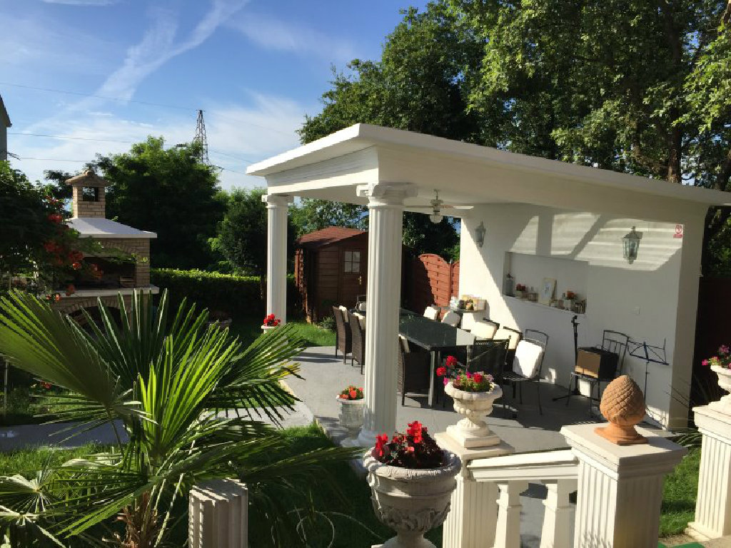 Im Garten befindet sich ein Schwimmbad, falls erforderlich mit beheiztem Wasser, Liegestühle und Sonnenschirme, ein Herrenhaus, Gartengrill, Tischtennis.