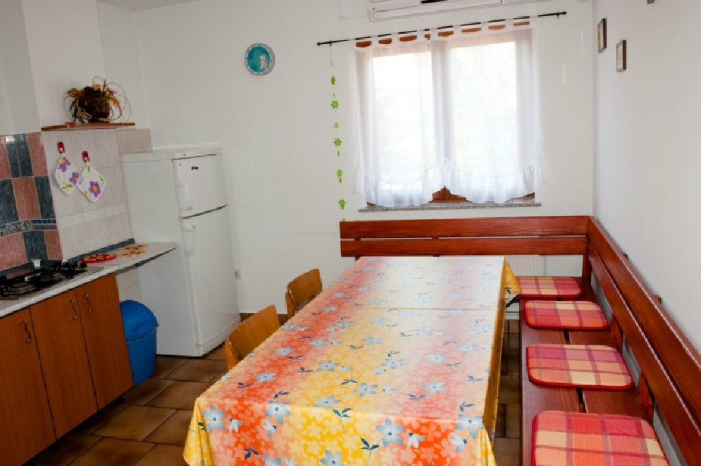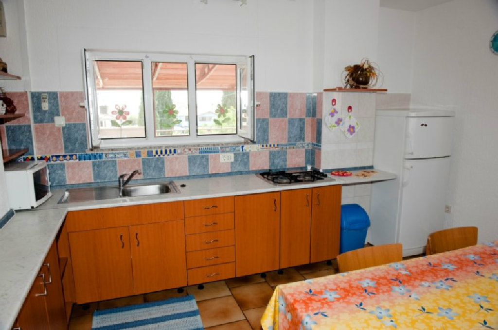 Die Küchenelemente sind 2,5 m lang, es gibt: Gasherd, Kühlschrank, Gefrierschrank, Mikrowelle. Küchentisch für 6 Personen.