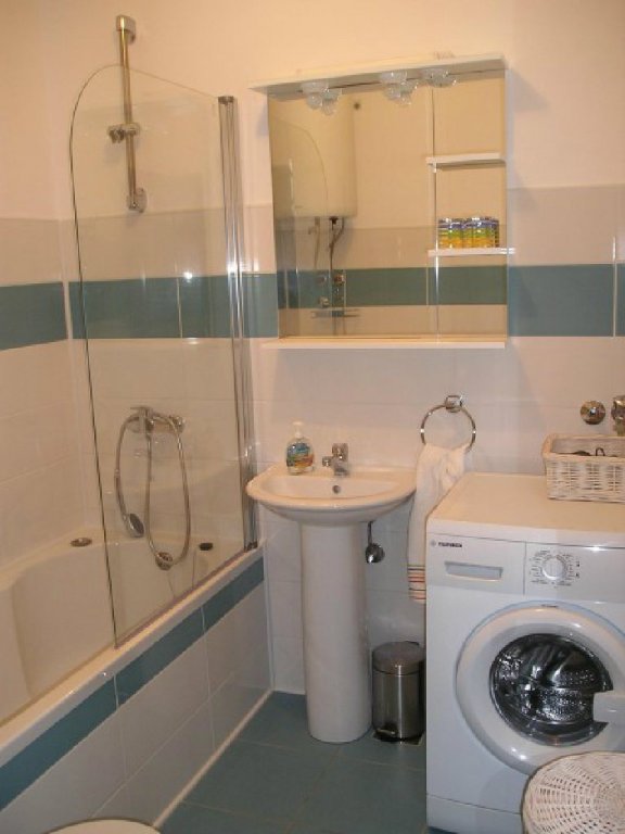 einem Wohnzimmer mit zwei Betten, Essecke, Bad mit Wanne und Dusche, Waschmaschine, WC,