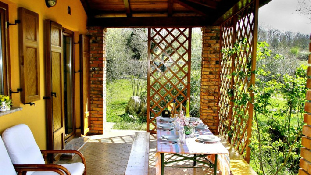 Die Gäste können am Kamin oder auf der Terrasse im Garten entspannen.