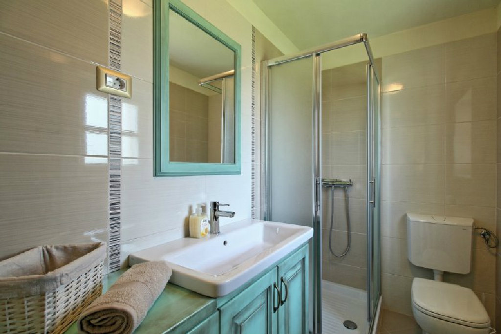 Auf der ersten Etage gibt es zwei klimatisierte Doppelzimmer, die einen gemeinsamen Balkon teilen, und eine separate Dusche / WC.